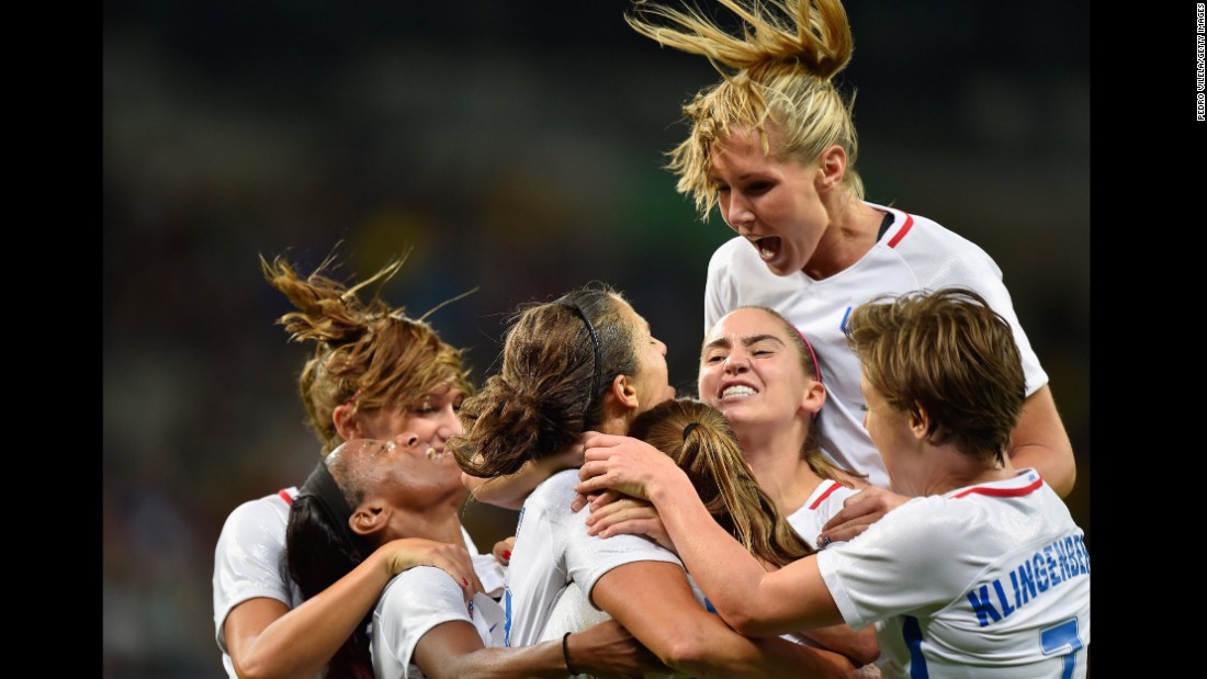 احتفلت كارلي لويد من الولايات المتحدة مع فريقها بعد أن سجل في المجموعة G مباراة الجولة الأولى للسيدات بين الولايات المتحدة الأميركية وفرنسا، وفازت الولايات المتحدة في المباراة 1-0.