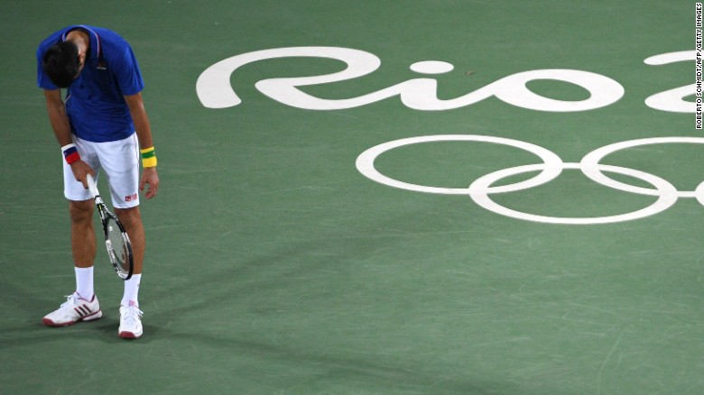 اللاعب نوفاك ديوكوفيتش من صربيا يسقط رأسه، حزنًا بعد خسارته نقطة خلال الجولة الأولى مباراة في كرة المضرب الفردي، ضد الأرجنتيني خوان مارتن ديل بوترو. وفاز الأرجنتيني ديوكوفيتش 7-6 و7-6.