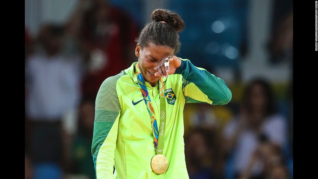 بكت لاعبة الجودو رافاييلا سيلفا على منصة التتويج بعد أن منحت بلادها البرازيل أول ميدالية ذهبية في منافسات الجودو للسيدات فئة 57 كيلوجرام .