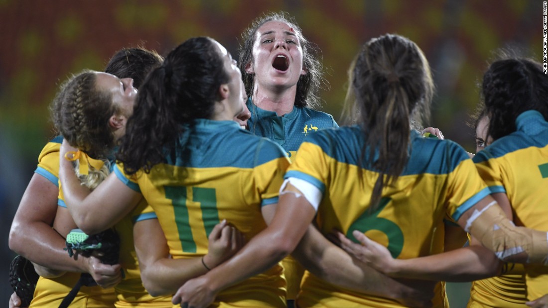 احتفل لاعبي الرجبي الأستراليين بعد فوزهم على نيوزيلندا في المباراة بالميدالية الذهبية 24-17، وهذه هي السنة الأولى التي يتم فيها لعب الرجبي في دورة الالعاب الأولمبية.