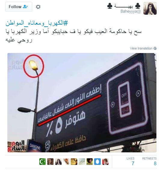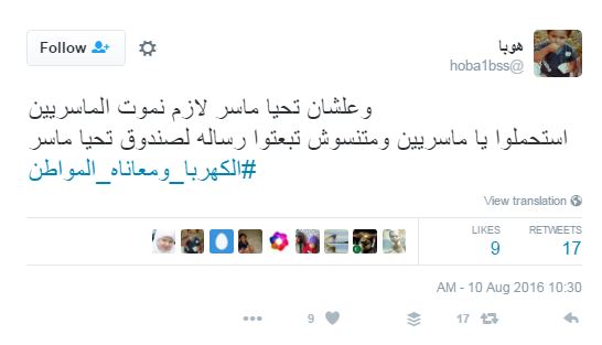 وتداول مغردون أزمة الكهرباء، عبر مواقع التواصل الاجتماعي، ودشنوا هاشتاج “#الكهربا_ومعاناة_المواطن” ، علقوا من خلاله بتغريدات غاطبة تارة وساخرة تارة، من أزمة الكهرباء وحلول الحكومة الغير رشيدة في حلول الأزمات