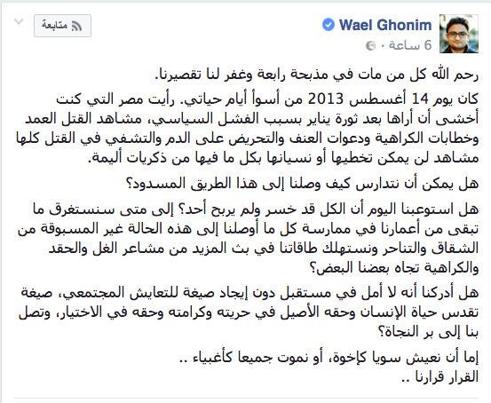 وصف الناشط السياسي، وائل غنيم ، يوم 14 أغسطس 2013 بأسوأ أيام حياته” مذبحة رابعة”، وقال: رأيت مصر التي كنت أخشى أن أراها بعد ثورة يناير بسبب الفشل السياسي.