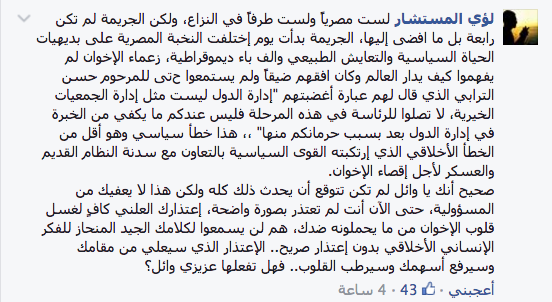 وقال في تعليقه على منشور وائل غنيم :”هذا خطأ سياسي وهو أقل من الخطأ الأخلاقي الذي إرتكبته القوى السياسية بالتعاون مع سدنة النظام القديم والعسكر لأجل إقصاء الإخوان”.
