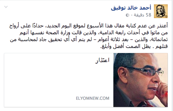 اعتذر الكاتب والأديب أحمد خالد توفيق عن كتابة مقاله لهذا الأسبوع في موقع “اليوم الجديد” بسبب الذكرى الثالثة لمجزرة فض اعتصام رابعة العدوية.