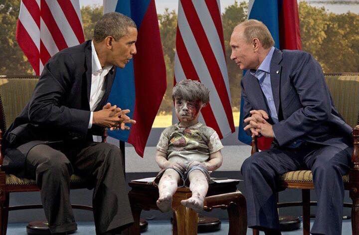 وتم نشر صور توضح مدى الصمت الدولي، من خلال وضع صورة عمران بين أوباما وبوتين.
