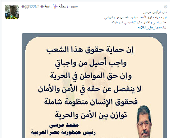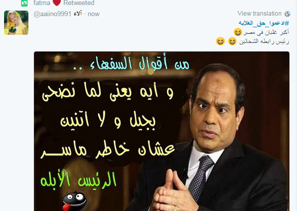 دشن مغردو موقع التدوين العالمي”تويتر” هاشتاج “ادعموا حق الغلابة” ضد رسائل السيسي العشرة التي دعا خلالها الى الترشيد والتقشف، في ظل زيادة معدل البطالة والفقر، بالاضافة الى ارتفاع معدل التضخم وانخفاض قيمة الجنيه المصري مقابل الدولار الأمريكي والذي اقترب من الوصول إلى 13 جنيه.