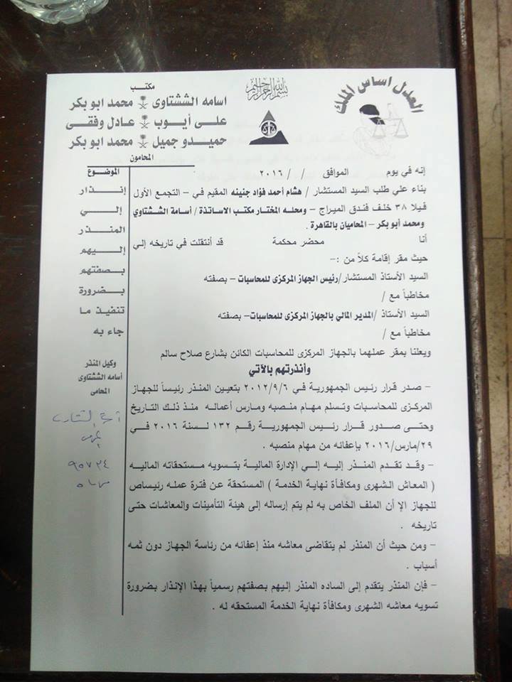 تقدم أسامة الششتاوي محامي المستشار هشام جنينة الرئيس السابق للجهاز المركزي للمحاسبات، بإنذار على يد محضر إلى كل من رئيس الجهاز المركزي للمحاسبات الحالي، والمدير المالي بالجهاز المركزي للمحاسبات بصفتهما، للحصول على مستحقاته