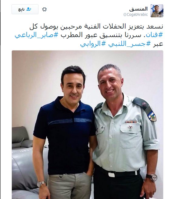 تسبب نشر صورة للفنان صابر الرباعي على الحساب الرسمي لوحدة تنسيق أعمال الحكومة الاسرائيلي في المناطق، على موقع التواصل الاجتماعي “تويتر” اليوم الإثنين، برفقة يواف موردخاي الضابط برتبة رائد في القيادة الوسطى بجيش الاحتلال الإسرائيلي، قبل إحياء حفل فني برام الله، في إثارة غضب الجمهور العربي.