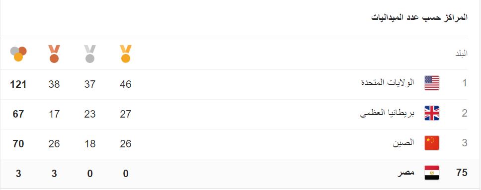 وتصدرت الولايات المتحدة المقدمة بعدد ميداليات 121 ميدالية، منهم 46 ميدالية ذهبية، في حين احتلت مصر المركز الـ 75 بواقع 3 ميداليات برونزية ولم تنجح في الحصول على ذهبية أو فضية.