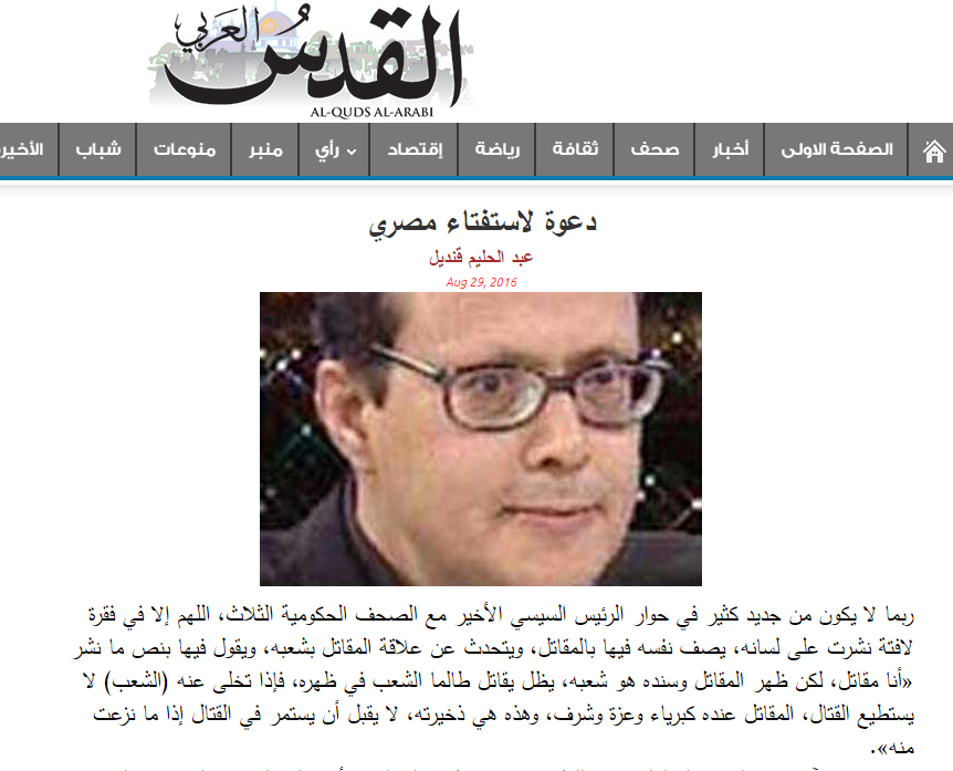 وفي مقال له على موقع “القدس العربي” دعا إلى استفتاء الشعب مباشرة في برنامج “الإصلاح” مضيفًا: الرضــا أو الغضب لا يظهر بغير البث المباشر لصوت الشعب.