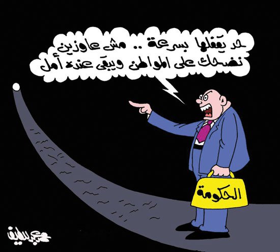 وعبر كاريكاتير ساخر لـ”اليوم السابع”، على عدم وجود أمل لدى المواطن فى الحكومة بشأن ما تتخذه من إجراءات إصلاحية لتحسين أحوال المواطنين، حيث ورسمت كاريكاتيرا ساخرا لـ”ممثل الحكومة” يرى ضوء فى نهاية النفق، قائلا: “حد يقفلها بسرعة.. مش عاوزين نضحك على المواطن ويبقى عنده أمل”.