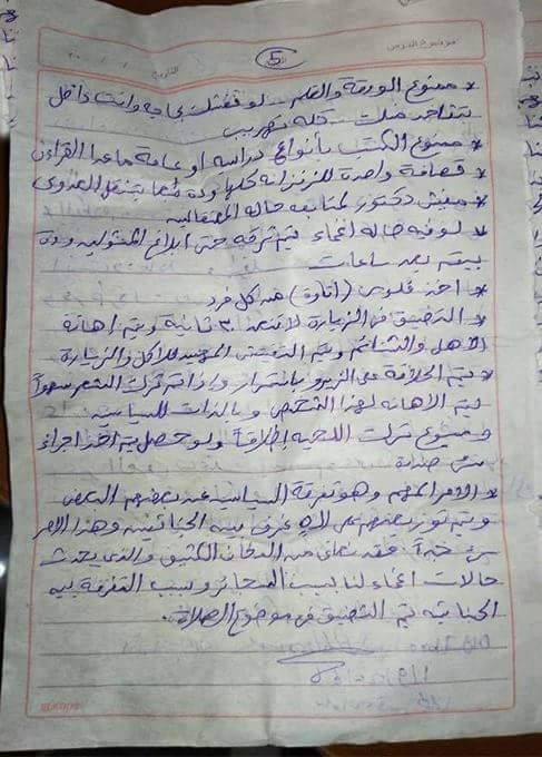 نص الرسالة كالتالي : وضع المركز هنا صعب جدًا في البداية لما نيجي هنا بندخل الثلاجة وده بيكون بكلبشة خلفي ومتغمي لحد إما نروح لأمن الدولة، لإما نروح لهم لإما يجولك لحد عندك بعدة التعذيب والكهربا وما خفي كان أعظم، في النهاية لما بندخل السجن قبلها بيجردوك من ملابسك كاملة ما عدا الداخلي وبندخل ع الاستقبال، إهانة وتعذيب وضرب وبنتعلق علي عروسة ومتكلبشين من اليدين والرجلين واليدين مرفوعين لمدة طويلة جدًا لدرجة الخدلان، بجانب الضرب بالعصيان واليد والصفعات متتالية مبتنتهيش، بعدين بتنزل الأوضة تنام قدام الحمام.