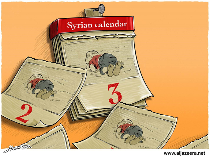 وفي الشأن العربي تناول موقع “عربي 21” الهزائم المتتالية لتنظيم الدولة ، في حين خصصت الجزيرة كاريكاتير اليوم لضحايا الهجرة نتيجة الحروب ورسمت تقويم به صور للطفل إيلان.