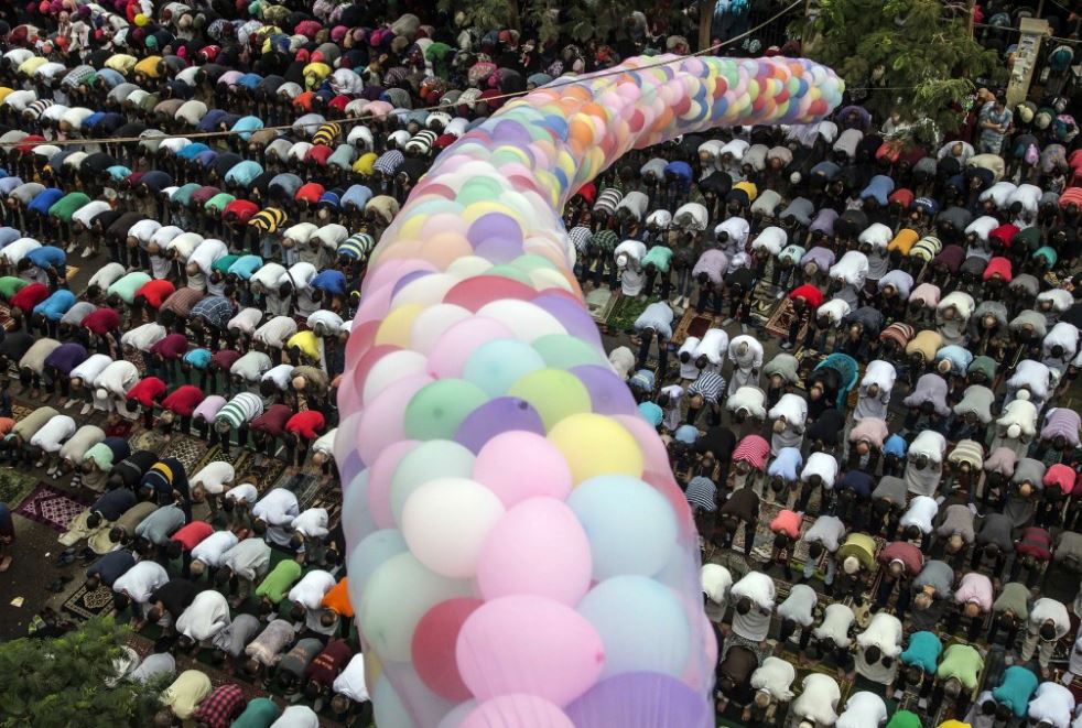 13- وسط البالونات، المسلمون في القاهرة يؤدون الصلوات في مسجد الصديق بالقاهرة.