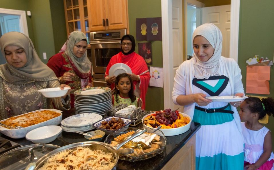15- مسلمات يحضرن الطعام المتعارف عليه في عيد الاضحى وهو “الفتة”.