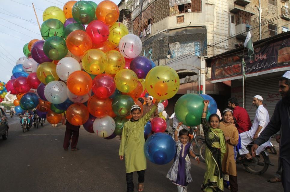 4- الأطفال يحتلفلون بعيد الأضحى بشراء البالونات في كراتشي، باكستان.