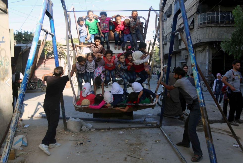8- في سوريا، الاطفال تقتبس لحظات الفرح في العيد على أرجوحة، رغم الدمار الذي يحيط بهم