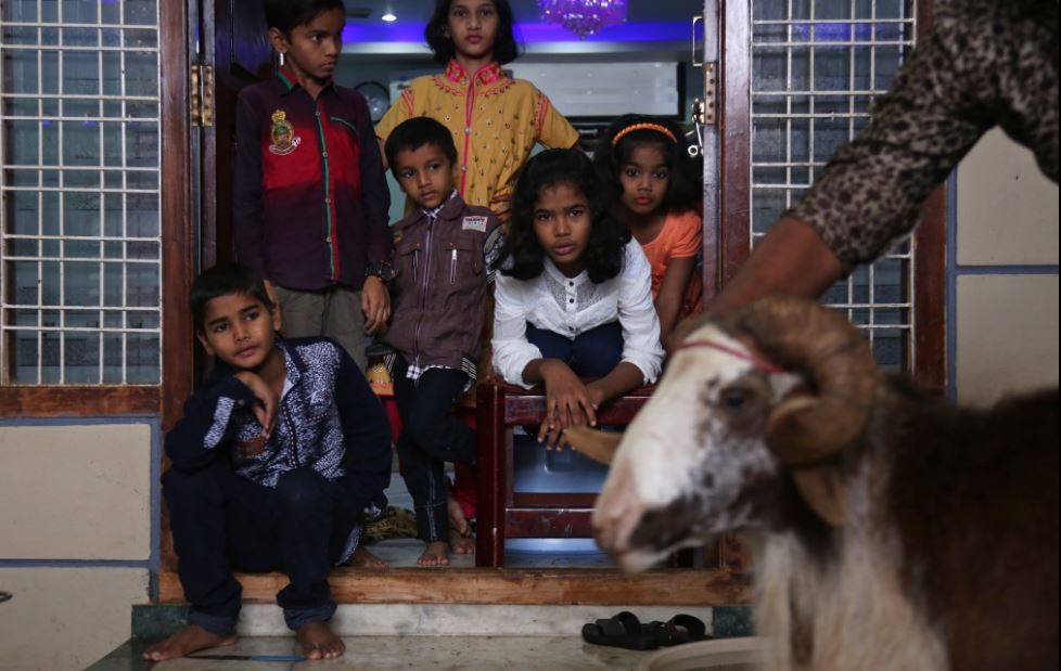 9- أطفال المسلمين يشاهدون اضحية على وشك الذبح في حيدر أباد، الهند