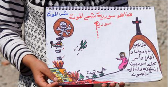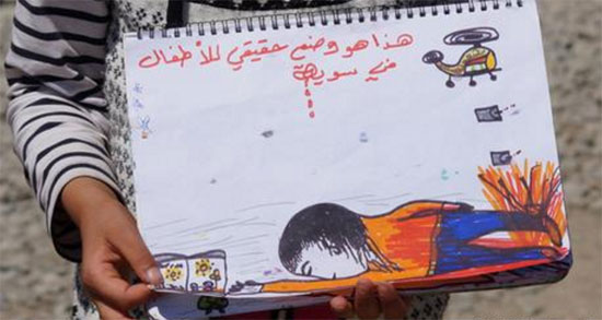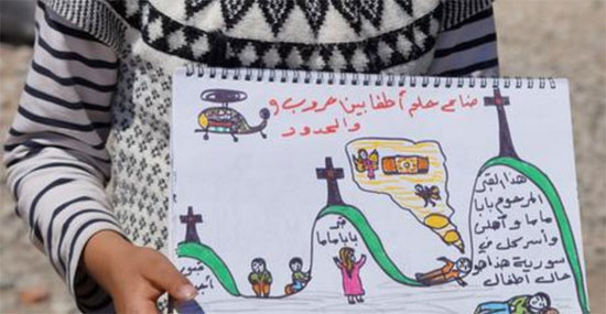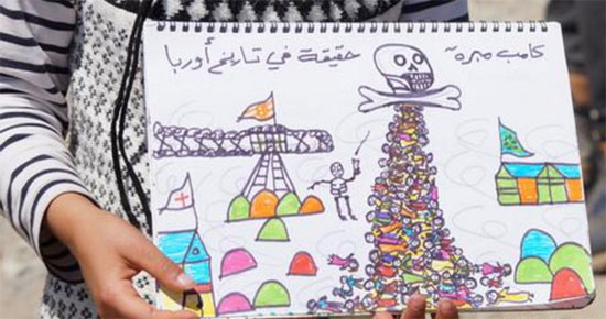 ولخصت الطفلة السورية التي تعيش بأحد مخيمات اللاجئين في اليونان، عن ما رأته من موت وفراق وحياة مضطربة داخل وطنها أو خارجه، بعدة رسومات، عبرت فيها عن مشاعرها ومخاوفها.