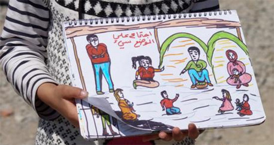 ورسمت الطفلة اجتماعًا لعدد من اللاجئين في المخيم، يشكون ويتبادلون الهموم التي يعانون منها ، فلا سبيل لديهم إلا الشكوى لذويهم.