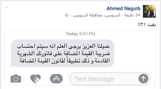 وتؤكد منى أحمد، أنها استقبلت أمس رسالة على هاتفها المحمول من إحدى شركات الاتصالات بعد تجديد باقة الرصيد الخاصة بها تؤكد لها أنه سيتم التعامل بأسعار القيمة المضافة بداية من المرة القادمة، علماً بأنها لم تطبق حتى الآن.