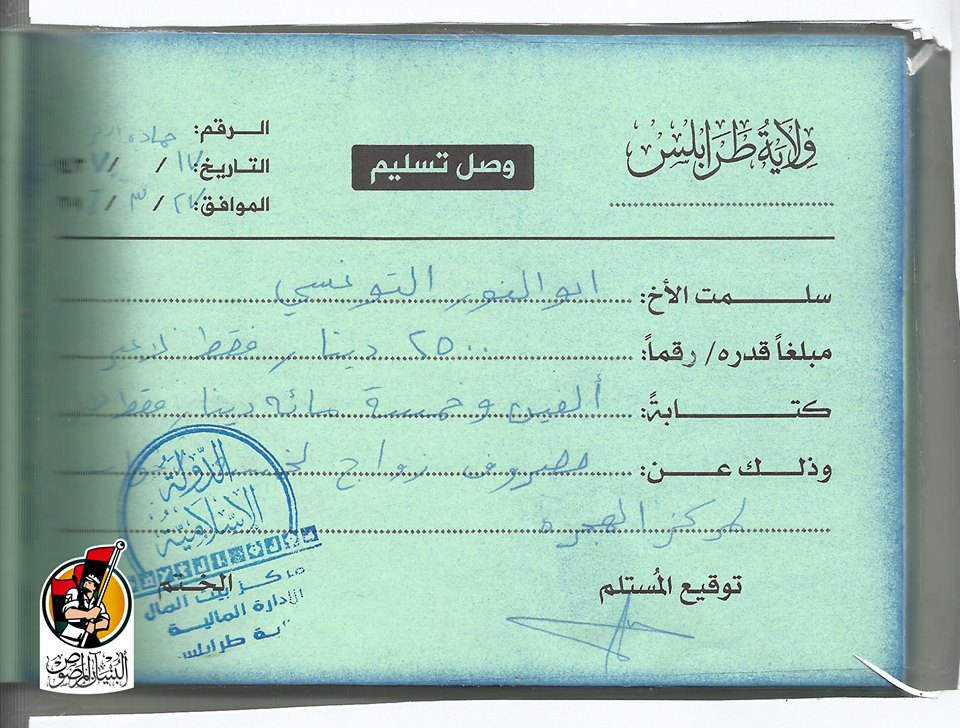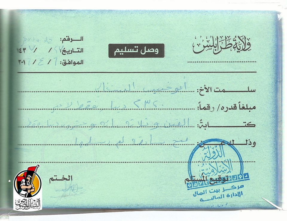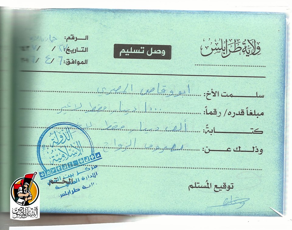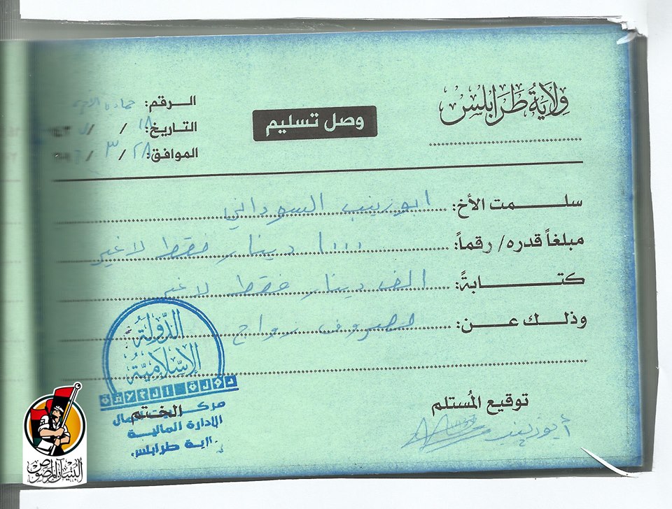 ومن الوثائق الأخرى، وصول مالية لعناصر التنظيم، بمبالغ بعضها كبير جدًا، حيث وقّع “أبو حمزة الكناني”، على استلام مبلغ يعادل 13.5 ألف دولار، كمكافأة عن شهر رجب فقط، وباع “أبو سعد السوداني” ثلاث سبايا بمبلغ لم يتجاوز الـ250 دولارًا، وتسلّم “أبو النور التونسي”، مبلغًا يقرب من الألفي دولار، لمساعدته في تكاليف الزواج.