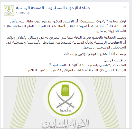 لكن جماعة “الإخوان المسلمون” أعلنت أن الدكتور محمود عزت مازال على رأس الجماعة قائماً بأمانته مؤدياً لمهمته كقائم بأعمال المرشد العام للجماعة، ونائبه إبراهيم منير.