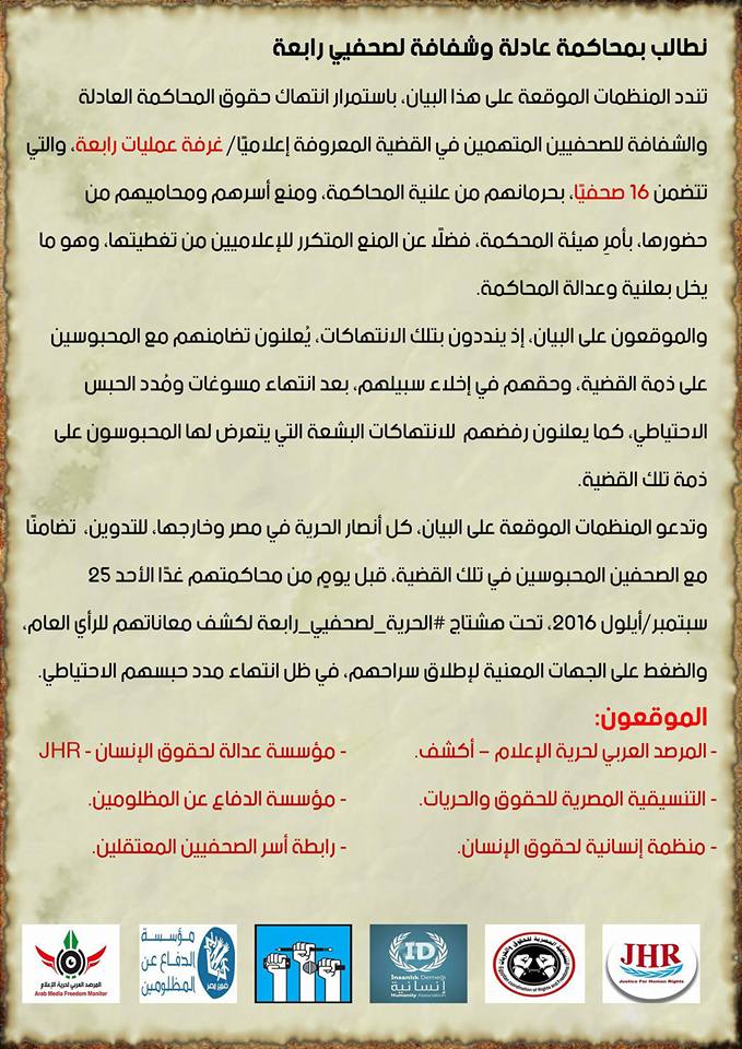 وفي بيان نشره المرصد العربي لحرية الإعلام، على صفحته بموقع التواصل الإجتماعي “فيس بوك”، نددت ستة منظمات حقوقية باستمرار انتهاك حقوق المحاكمة العادلة والشفافة للصحفيين المتهمين في قضية “غرفة عمليات رابعة”، والتي تتضمن 16 صحفيًا، بحرمانهم من علنية المحاكمة، ومنع أسرهم ومحاميهم من حضورها، بأمرِ هيئة المحكمة، فضلًا عن المنع المتكرر للإعلاميين من تغطيتها، وهو ما يخل بعلنية وعدالة المحاكمة.