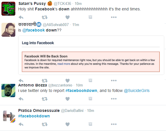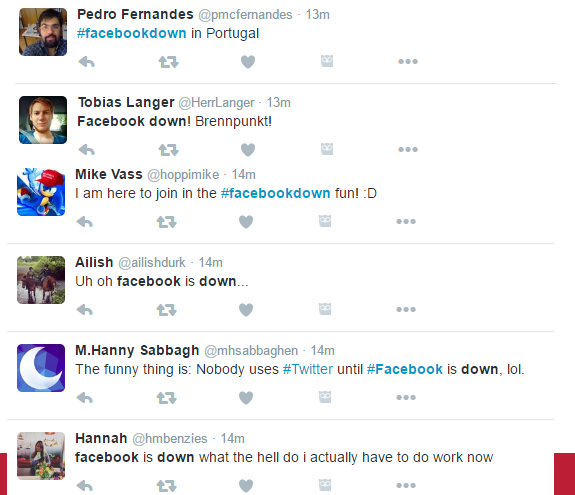 وعبر بعض مستخدمي “فيس بوك” عبر حساباتهم على الموقع المنافس له “تويتر” بنشر حالتهم التي تعبر عن توقف الموقع لديهم، متسائلين عما إذا كان باقي المستخدمين لديهم نفس المشكلة.
