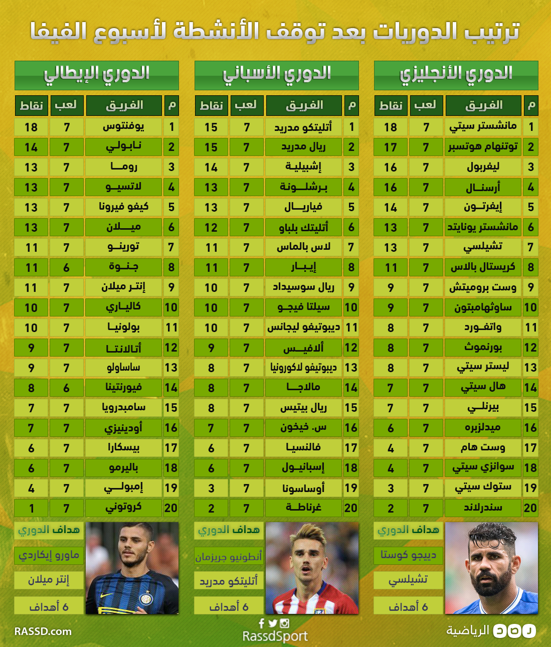 توقفت معظم دوريات كرة القدم الأوروبية بسبب استعداد معظم منتخباتها لخوض مباريات هذا الأسبوع، ويعرض موقع “رصد” لمتابعيه إحصائية ترتيب كل من الدوري الإنجليزي، والإسباني، والإيطالي في الانفوجراف التالي.