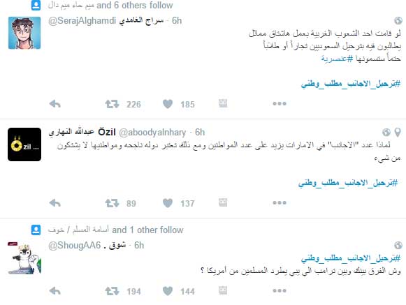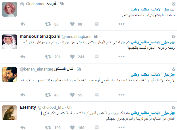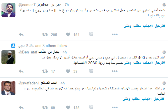 وتحت هذا الاسم، كتبت آلاف التغريدات في الهاشتاج الذي دخل قائمة الصدارة على الموقع في السعودية، وشهد آراء متناقضة، منها ماكان رافضًا لترحيل الأجانب من السعودية باعتبار أنهم ليسوا السبب في انخفاض ميزانية البلاد، ومنها ماكان موافقًا بحجة إفساح المجال للشباب السعودي للدخول في سوق العمل.