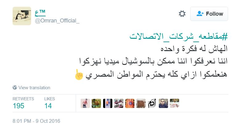 دشن مغردو موقع التدوينات الصغيرة “تويتر” هاشتاج يحمل اسم “#مقاطعه_شركات_الاتصالات”، وعلى الرغم من أن الحملة قام بها نشطاء خليجيين لمقاطعة شركات الاتصالات السعودية، إلا أن المصريين وجدوا غايتهم فيها، بسبب سوء خدمات شركات الاتصالات في مصر.