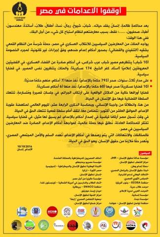 وقالت الحملة في بيان لها، أنه على مدار 3 سنوات ضد 793 حكمًا بالاعدام، نفذ منهم حكمًا مدنيًا، و10 قضايا عسكرية صدر فيها 60 خكمًا بالإعدام نفذ منها 6 أحكام عسكرية، في قضايا خالية من الدلائل الواقعية على ارتكاب الجرائم.