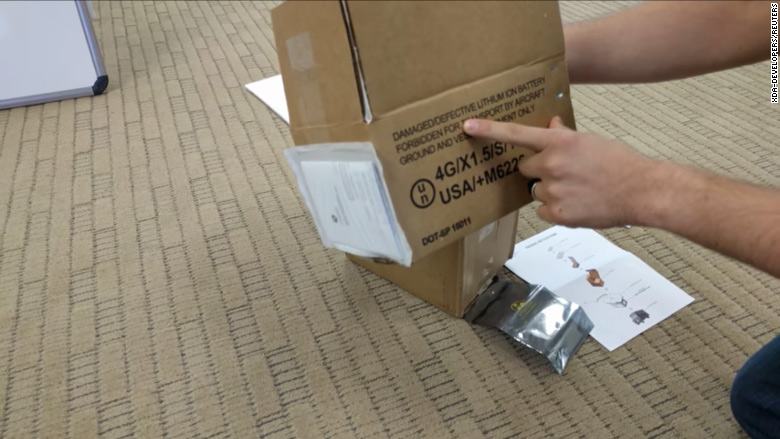 واحتوت الصناديق المضادة للاحتراق على تحذير، من نقل الهاتف جواً، بسبب مخاوف من أنها قد تنفجر في الهواء وتسبب مشكلات للطائرات”.