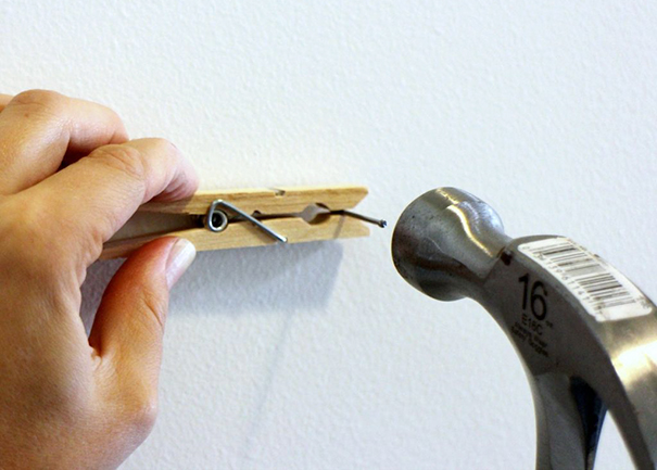 إذا كنت ممن يخشون دق المسامير حتى لا يصاب إصبعك في طرقة خاطئة، يمكنك تثبيت المسمار عن طريق مشبك الغسيل.