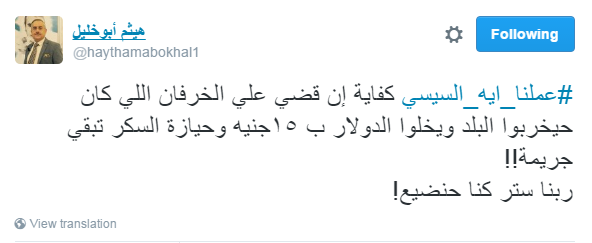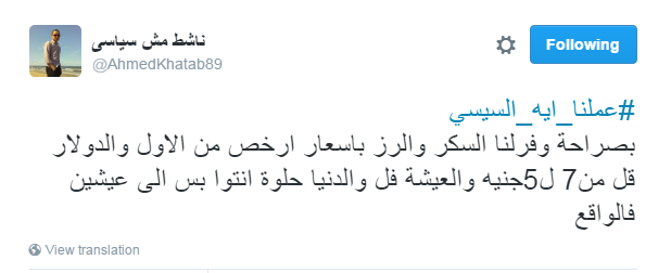 تصدر هاشتاج “عملنا إيه السيسي” قائمة الأعلى تداولاً على موقع التدوين العالمي”تويتر”، إذ انطلقت منه تغريدات تبادل فيه المغردون الأراء حول الأحوال السياسية والاقتصادية للبلاد.