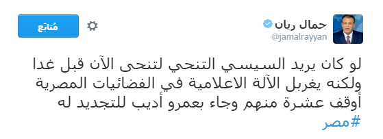 وأوضح ريان عبر حسابه على موقع التدوين المصغر “تويتر”: “لو كان يريد السيسي التنحي لتنحى الآن قبل غدًا، ولكنه يغربل الآلة الإعلامية في الفضائيات المصرية أوقف عشرة منهم، وجاء بعمرو أديب للتجديد له”.