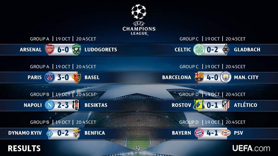 وبذلك الفوز عزز نادي برشلونة صدارته للمجموعة الثالثة من دوري الأبطال، حيث انتصر برباعية على ضيفه مانشستر سيتي دون رد، أحرز فيها نجم برشلونة اللامع ميسي 3 أهداف مساهمًا في فوز فريقه.