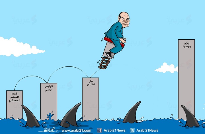 ونشرت “عربي 21” كاريكاتير ساخر من عبد الفتاح السيسي، يرصد مراحل استغلال السيسي للأخرين للوصول إلى أهدافه، بدءًا من كونه أحد أفراد المجلس العسكري، ثم استغلاله للرئيس محمد مرسي وتعيينه وزير دفاعه، وانقلابه عليه بدعم خليجي، وانتقاله مؤخراً إلى جبهة إيران وروسيا.