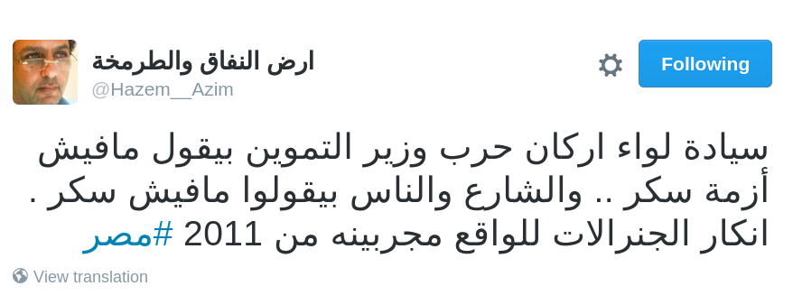 وقال في تغريدة عبر حسابه على موقع التدوين المصغر “تويتر”: “سيادة لواء أركان حرب وزير التموين بيقول مفيش أزمة سكر، والشارع والناس بيقولوا مفيش سكر، إنكار الجنرالات للواقع مجربينه من 2011.
