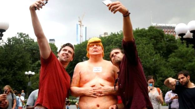 ظهرت تماثيل عارية بالحجم الطبيعي لدونالد ترامب المرشح الجمهوري للرئاسة الأمريكية، في عدد من شوارع مدن في الولايات المتحدة، منها نيويورك، ولوس أنجليس، وسياتل، وسان فرانسيسكو، وكليفلاند، حيث دشن مجموعة من النشطاء الأمريكيين في مجموعة ” INDECLINE”، حملة ضد المرشح الرئاسي الجمهوري دونالد ترامب، سخروا فيها من ترامب الذي أخذ مقامًا أكبر من حجمه على حد قولهم.