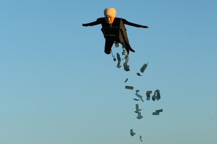 صمم أوتو ديفنباتش مجسم طائرة على هيئة دونالد ترامب، وجعله يحلق فوق  شاطئ كارلسباد في كاليفورنيا، هو يلقي بالأموال .