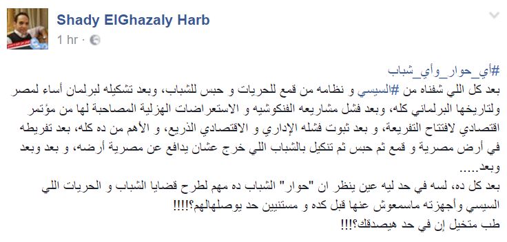وقال الغزالي حرب في تدوينة عبر صفحته الشخصية بموقع التواصل الاجتماعي “فيس بوك”: أي حوار وأي شباب، بعد كل اللي شفناه من السيسي و نظامه من قمع للحريات وحبس للشباب، وبعد تشكيله لبرلمان أساء لمصر ولتاريخها البرلماني كله، وبعد فشل مشاريعه الفنكوشية والاستعراضات الهزلية المصاحبة لها من مؤتمر اقتصادي لافتتاح التفريعة، وبعد ثبوت فشله الإداري والاقتصادي الذريع”.