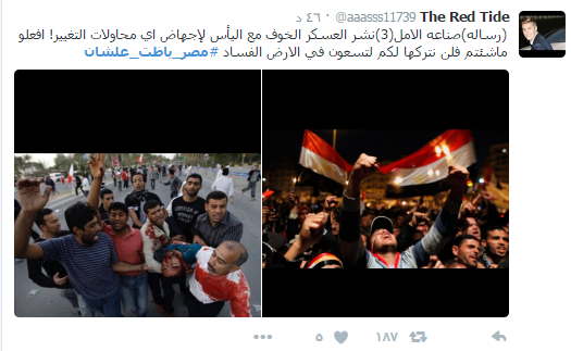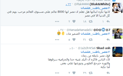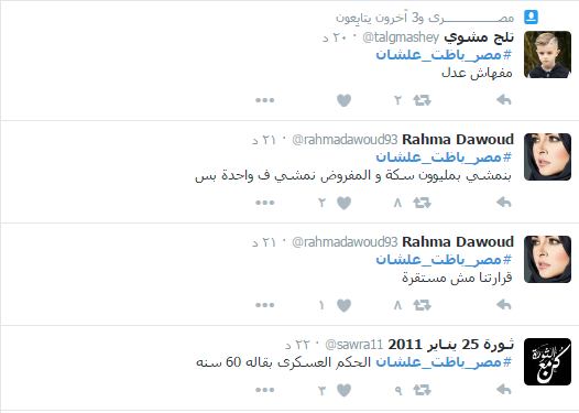 وتجلى غضب المغردون ايضا في اراءهم جراء غياب العدل في دولة العسكر التي استمر ما يقارب 60 عاما، ونشرهم حالة من الخوف واليأس من التغيير فضلا عن تخبط الدولة في قراراتها، لصالح فئة بعينيها.
