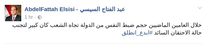 كتب عبدالفتاح السيسي تدوينه عبر صفحته الرسمية على موقع التواصل الاجتماعي “فيس بوك” قال فيها : “خلال العامين الماضيين حجم ضبط النفس من الدولة تجاه الشعب كان كبيرًا؛ لتجنب حالة الاحتقان السائد”.