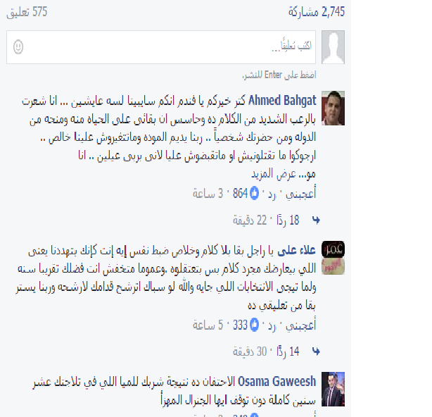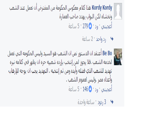 كما جاءت تعليقات بعض النشطاء توضح الفكر المغلوط للتدوينة، بأنه كلام معكوس، وأن من الطبيعي أن تعمل الحكومة عند الشعب وتخشاه، ضاربًا أحدهم المثال مستعجبًا: “البواب يهدد صاحب العمارة”.