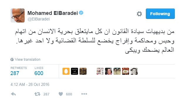 وقال البرادعى في تغريدة عبر حسابه الشخصي بموقع “تويتر”: من بديهيات سيادة القانون ان كل مايتعلق بحرية الانسان من اتهام وحبس ومحاكمة وإفراج يخضع للسلطة القضائية ولا احد غيرها العالم يضحك ويبكي”.