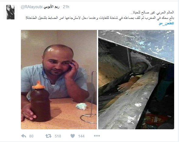وتداول نشطاء على شبكات التواصل الاجتماعي المختلفة مقطع فيديو، يُظهر عملية مصادرة رجال الأمن المغربي لكمية من الأسماك، وسُمع فيه صوت رجل أمن يدعو سائق شاحنة لـ”طحن” الشاب بآلة شفط النفايات، حينما أراد أن يحول دون إتلاف بضاعته.