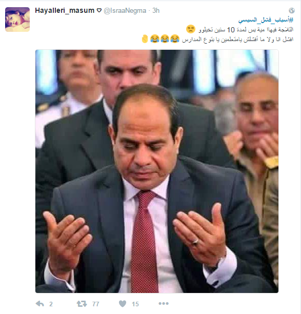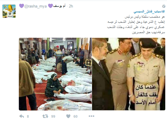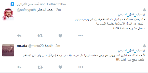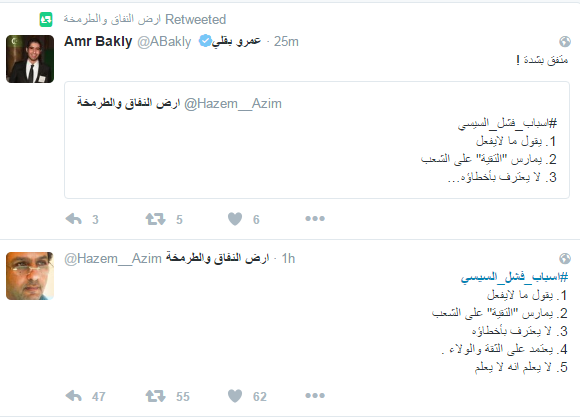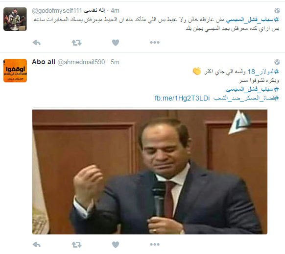 ودعا المشاركون الى رحيله، مؤكدين أن الحكم العسكري فشل في إدارة البلاد، وحصل هاشتاج “#اسباب_فشل_السيسي” على التريند الأول بموقع التواصل “تويتر”، وجاءت التغريدات كالتالي ..