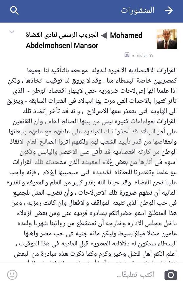 وكانت شبكة “رصد”، قد حصلت على هذه الرسالة من داخل صفحة خاصة للقضاة على موقع التواصل الاجتماعي “فيس بوك”، تحمل اسم “الجروب الرسمي لنادي القضاة”، نشر فيها المستشار محمد عبد المحسن منصور نائب رئيس محكمة النقض، منشور أعرب فيه عن عدم رضاه التام للقرارت الاقتصادية التي اتخذها السيسي وحكومة شريف إسماعيل، معتبرًا أن تلك القرارات تزيد من معاناة البسطاء.